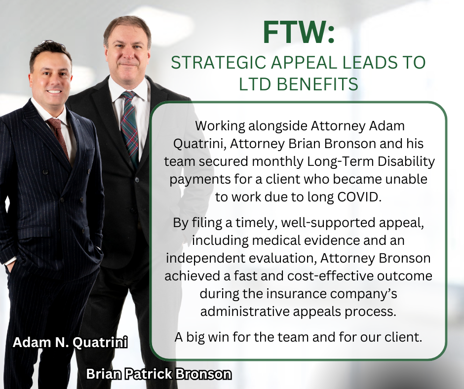 Working alongside Attorney Adam Quatrini, Attorney Brian Bronson and his team secured monthly Long-Term Disability payments for a client who became unable to work due to Long COVID.
